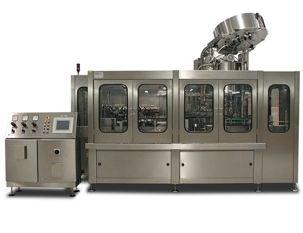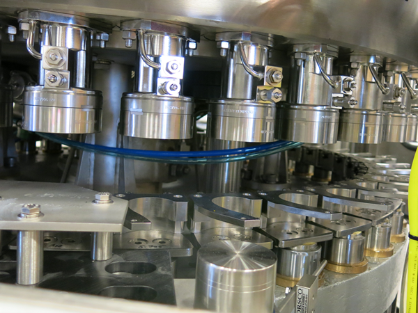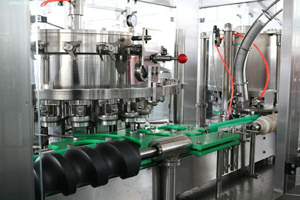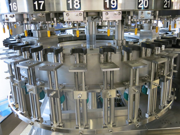 La parte de llenado está compuesta principalmente por una válvula de llenado y partes de transmisión de llenado. La botella lavada alcanza la posición de llenado a través de la rueda de desplazamiento de la botella. Mientras tanto, la placa de sujeción de la botella de la máquina llenadora sujetará la botella y se moverá hacia arriba para sellar la botella, la válvula de llenado se abrirá y enviará el líquido a la botella.